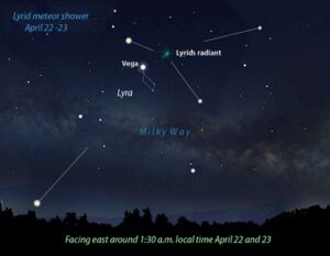This shower is the result of the Earth passing through the remains of Comet C1861 G1 Thatcher. It is called the Lyrids as the meteors appear from the area of a constellation Lyra